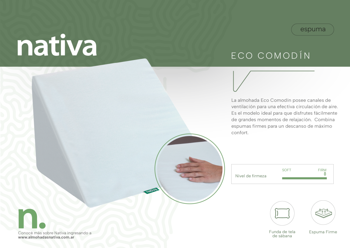 La almohada Eco Comodín de Nativa está diseñada para brindar un descanso ergonómico, combinando espumas firmes de alta calidad con un diseño anatómico pensado para acompañar el cuerpo en diferentes posiciones de relajación. Su forma permite elevar suavemente la espalda, las piernas o la zona lumbar, ofreciendo soporte estable y aliviando la presión en zonas específicas del cuerpo.