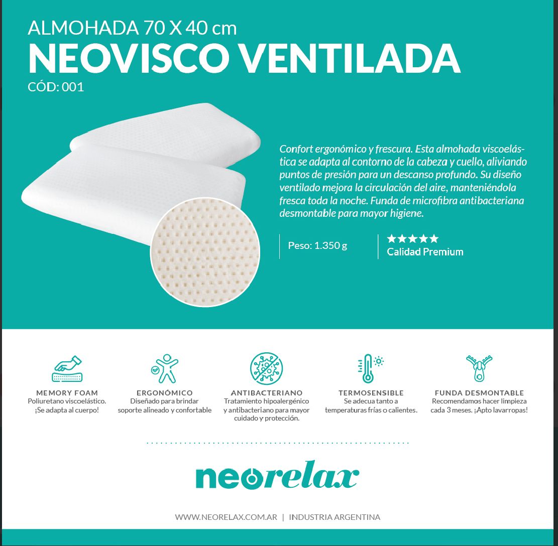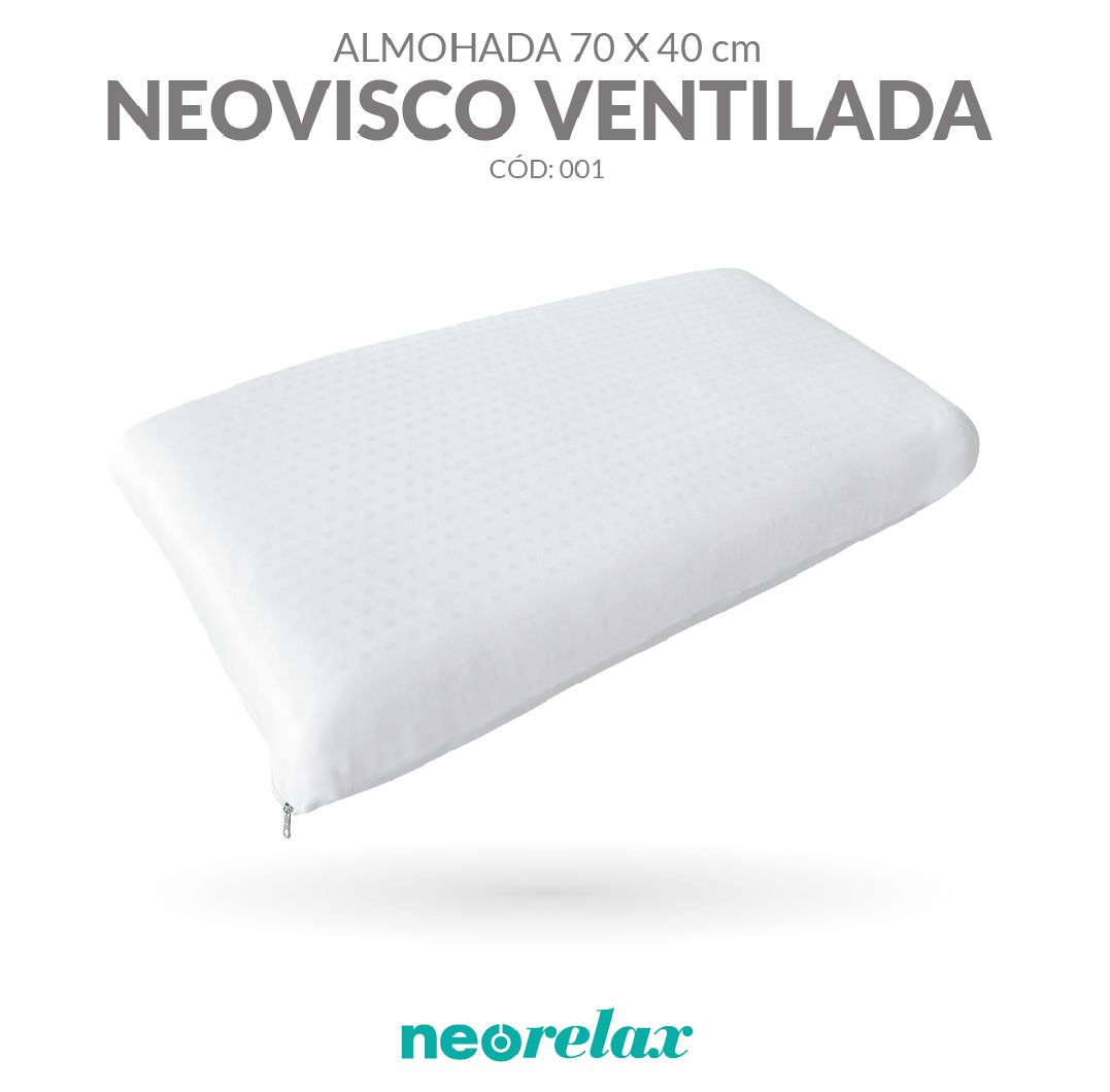La almohada Neorelax Ventilada combina tecnología viscoelástica de alta densidad con un diseño ventilado que mejora la circulación del aire, manteniéndola fresca durante toda la noche.