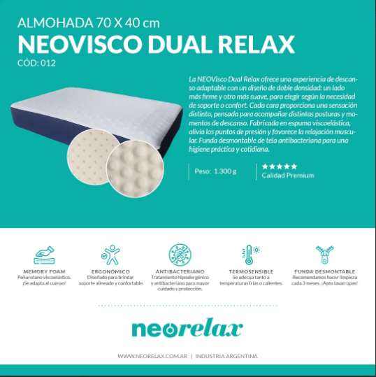 La almohada Neorelax Dual Relax  combina tecnología viscoelástica con un diseño de doble densidad, ofreciendo dos sensaciones en una sola almohada: un lado más firme y otro más suave, para que puedas elegir el nivel de soporte y confort ideal para cada noche.