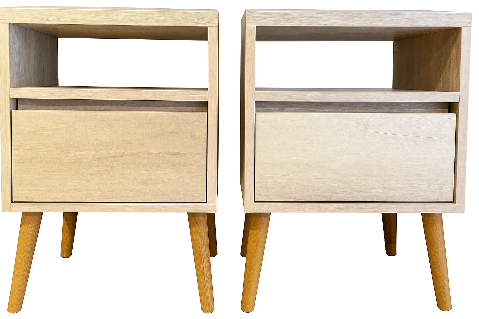 Combina una estructura de melamina texturada color madera clara con patas de madera maciza, logrando un equilibrio perfecto entre calidez natural y estilo contemporáneo.